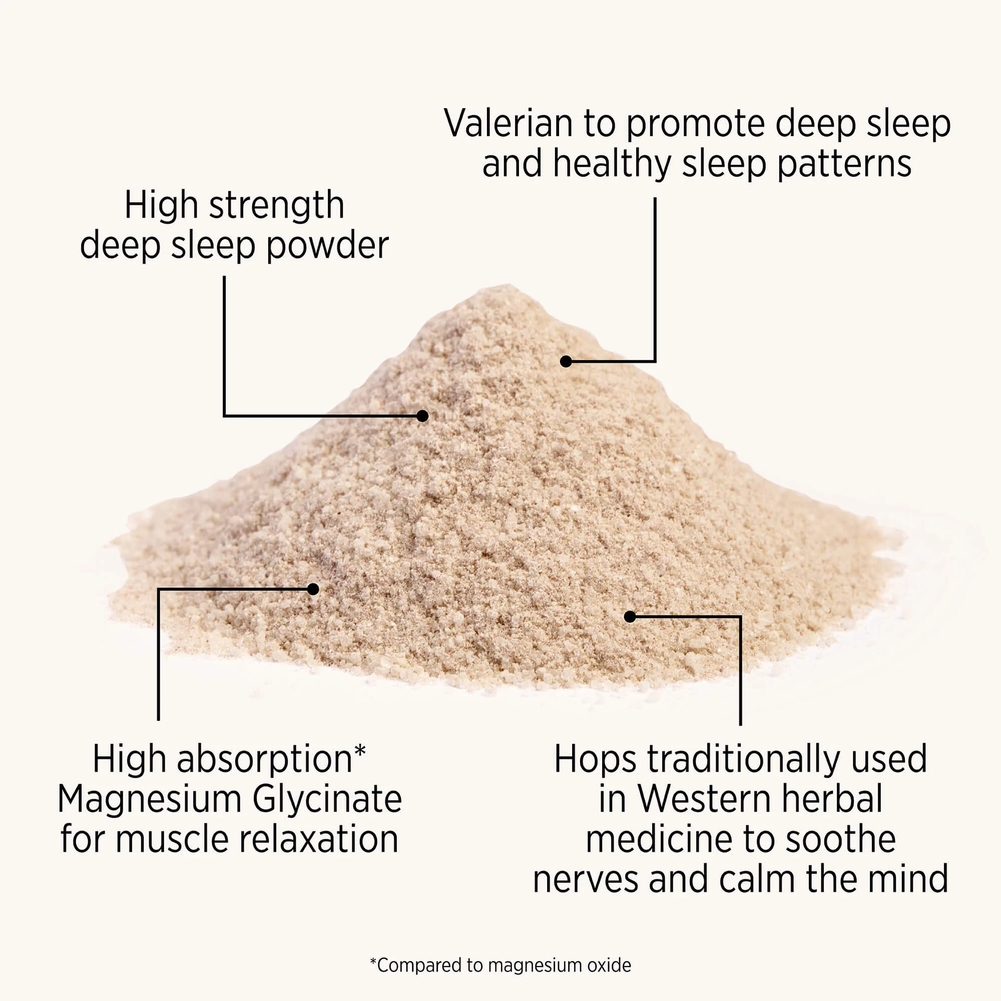High strength powder providing a triple action formula containing 350mg of elemental Magnesium from Glycinate to support muscle relaxation & nervous system health; Valerian to support deep sleep and healthy sleeping patterns; and Hops traditionally used in Western herbal medicine to soothe nerves and calm the mind.